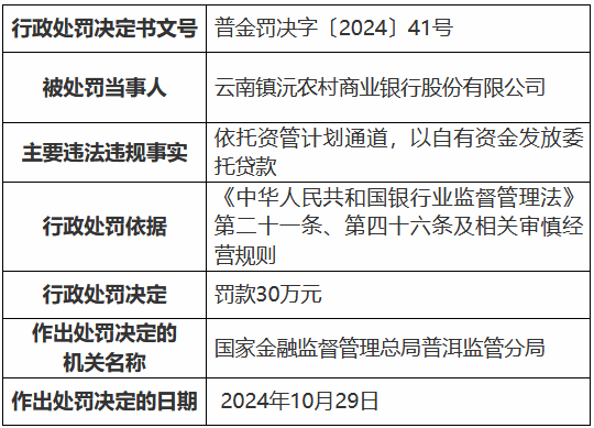 11月13日金融一线音问,国度金融监督处理总局普洱监管分局行政处罚信息公开表深入开云kaiyun体育,云南镇沅农村生意银行股份有限公司因依托资管野心通谈,以自有资金披发交付贷款,被罚金30万元。杨光宗(时任原镇沅彝族哈尼族拉祜族自治县农村信用协作联社理事长)对“依托资管野心通谈,以自有资金披发交付贷款”事项负有牵扯,受到警告。