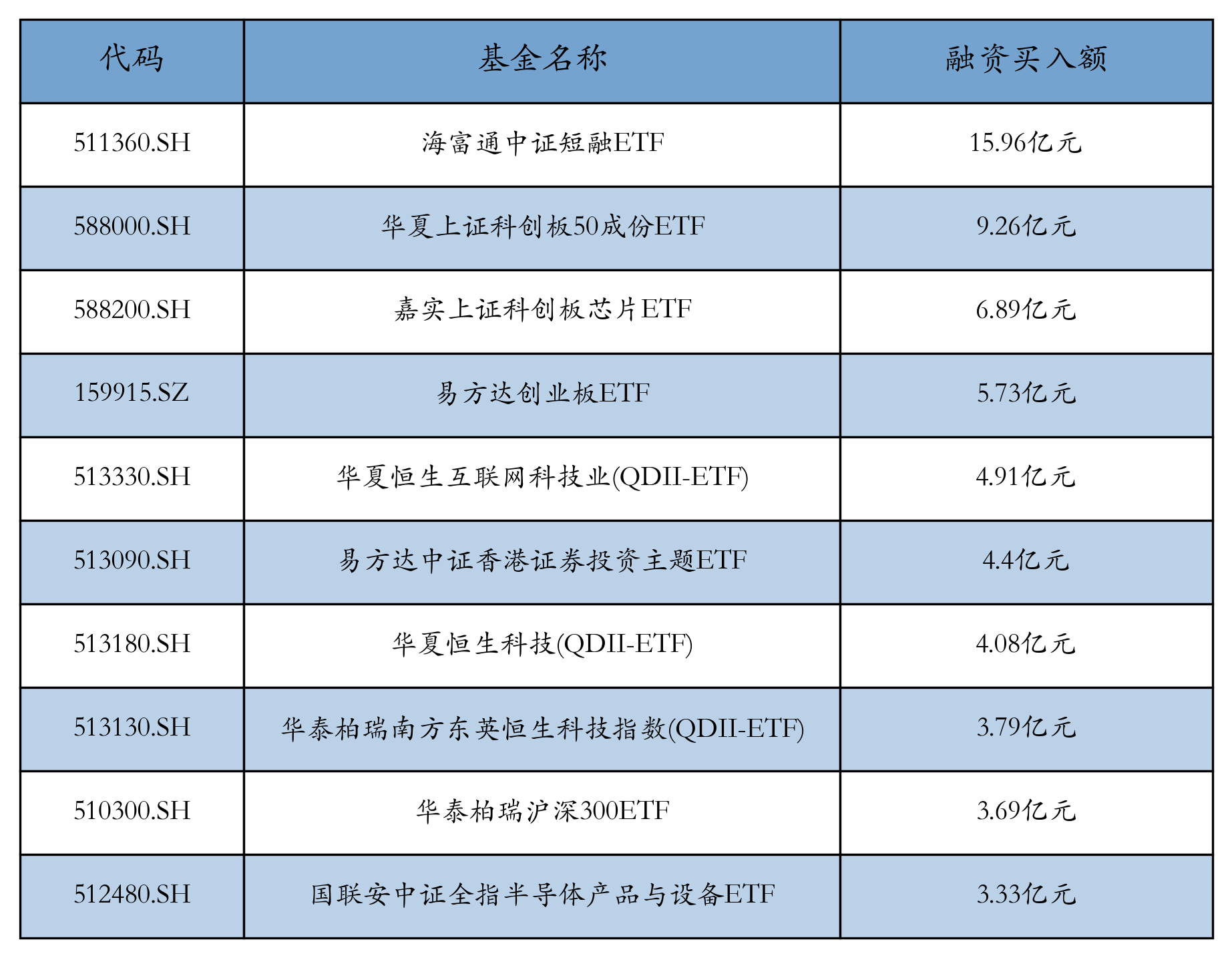 12月4日ETF融资买入额前三位分手为:海富通中证短融ETF(15.96亿元)、中原上证科创板50成份ETF(9.26亿元)和嘉实上证科创板芯片ETF(6.89亿元),前10具体见下表: