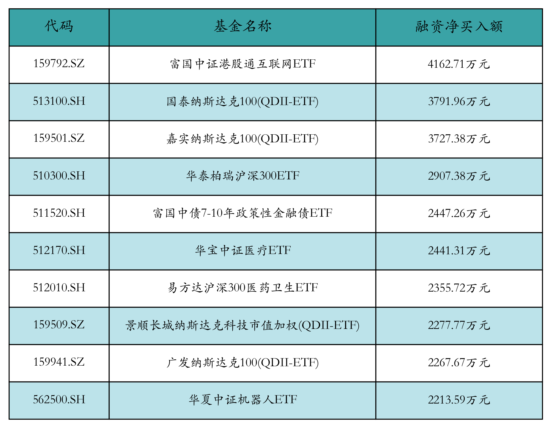 12月4日ETF融资净买入额前三位分手为:富国中证港股通互联网ETF(4162.71万元)、国泰纳斯达克100(QDII-ETF)(3791.96万元)和嘉实纳斯达克100(QDII-ETF)(3727.38万元),前10具体见下表: